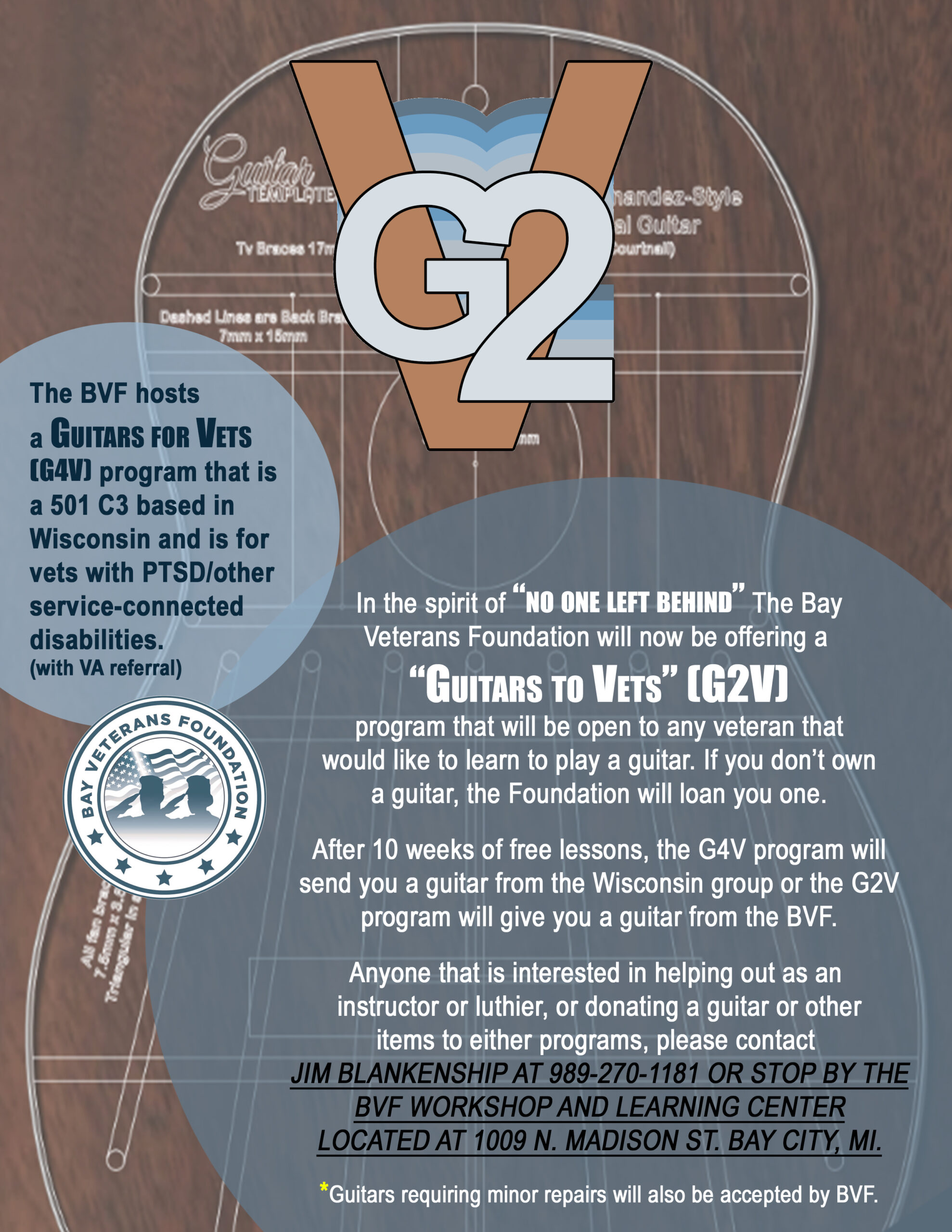 December 15, 2025 @ 12:00 am - December 15, 2026 @ 12:00 am Guitars 2 Vets – CLICK HERE Bay Veterans Workshop and Learning Center 1009 N. Madison Ave, Bay City, United States Guitars 2 Vets
